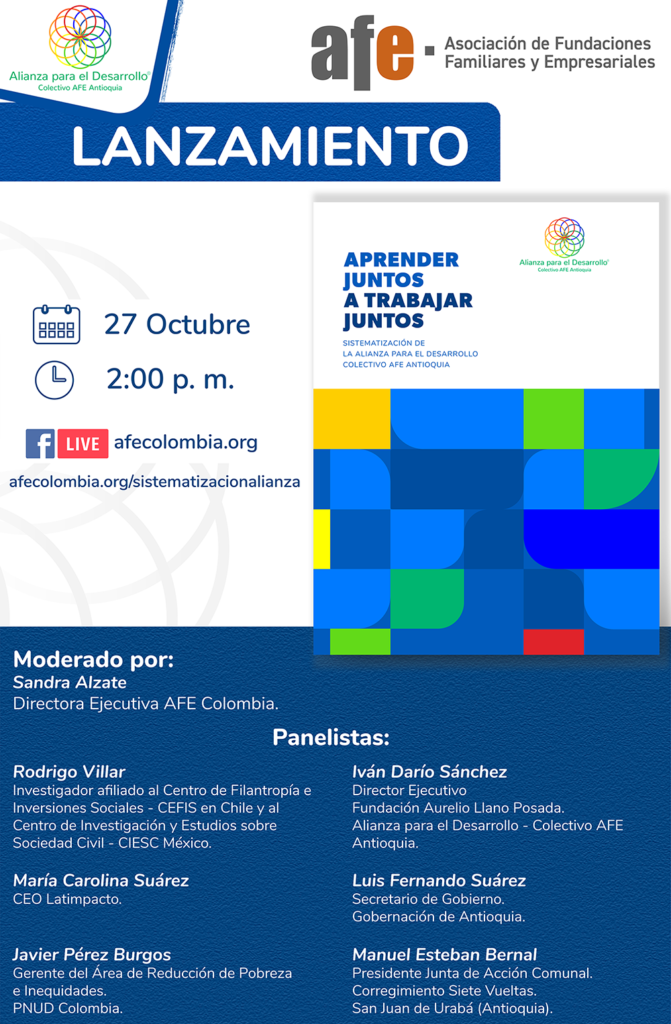 La Asociación de Fundaciones Familiares y Empresariales- AFE tiene el gusto de invitarles al lanzamiento de la publicación «Aprender Juntos a trabajar Juntos» Sistematización de la Alianza para el Desarrollo – Colectivo AFE Antioquia donde se recopila la experiencia de trabajo colectivo de 17 fundaciones empresariales y familiares de la AFE que lograron dejar a un lado sus propios intereses y unir sus recursos, experticias y metodologías para contribuir al desarrollo del país.